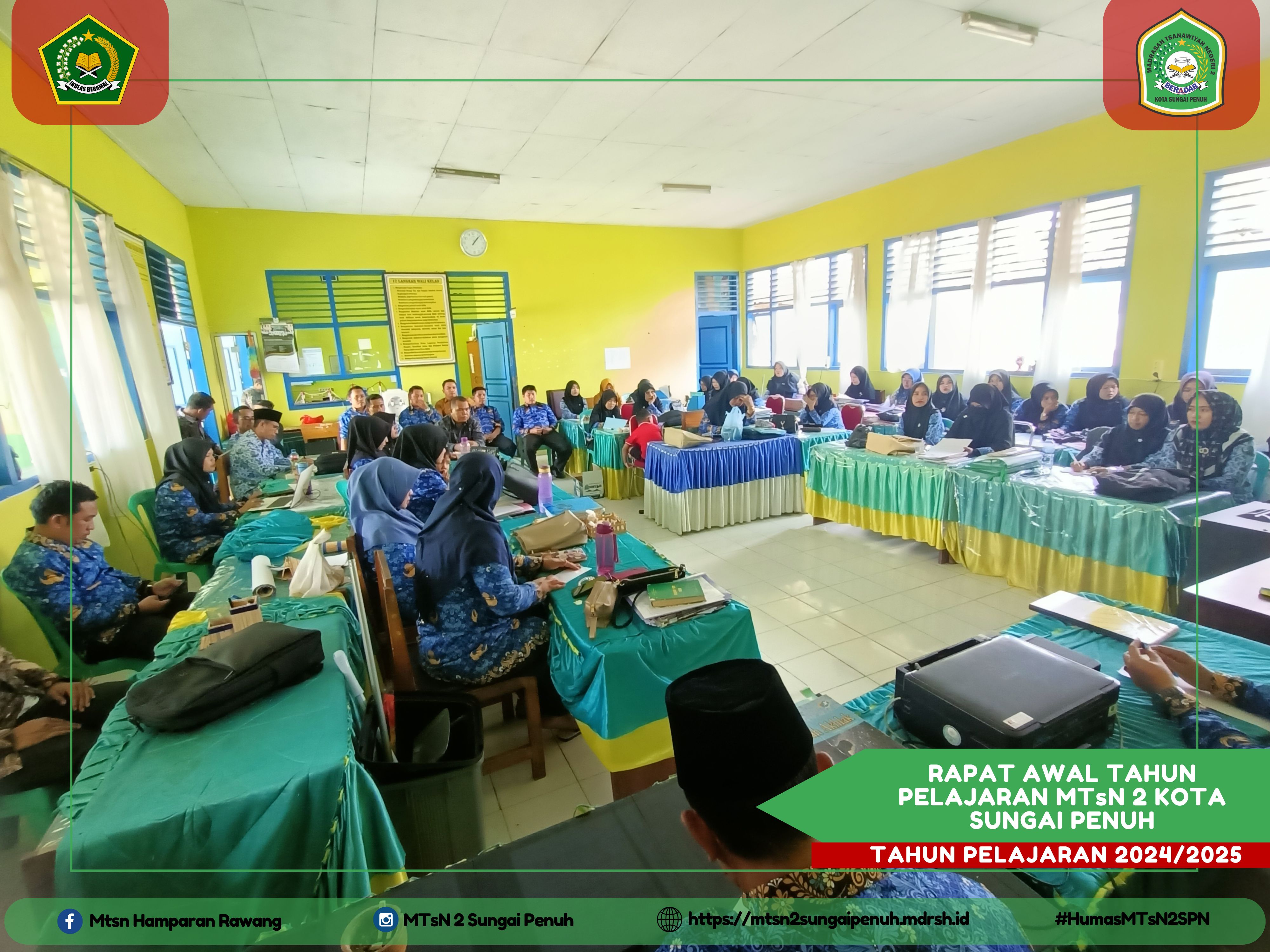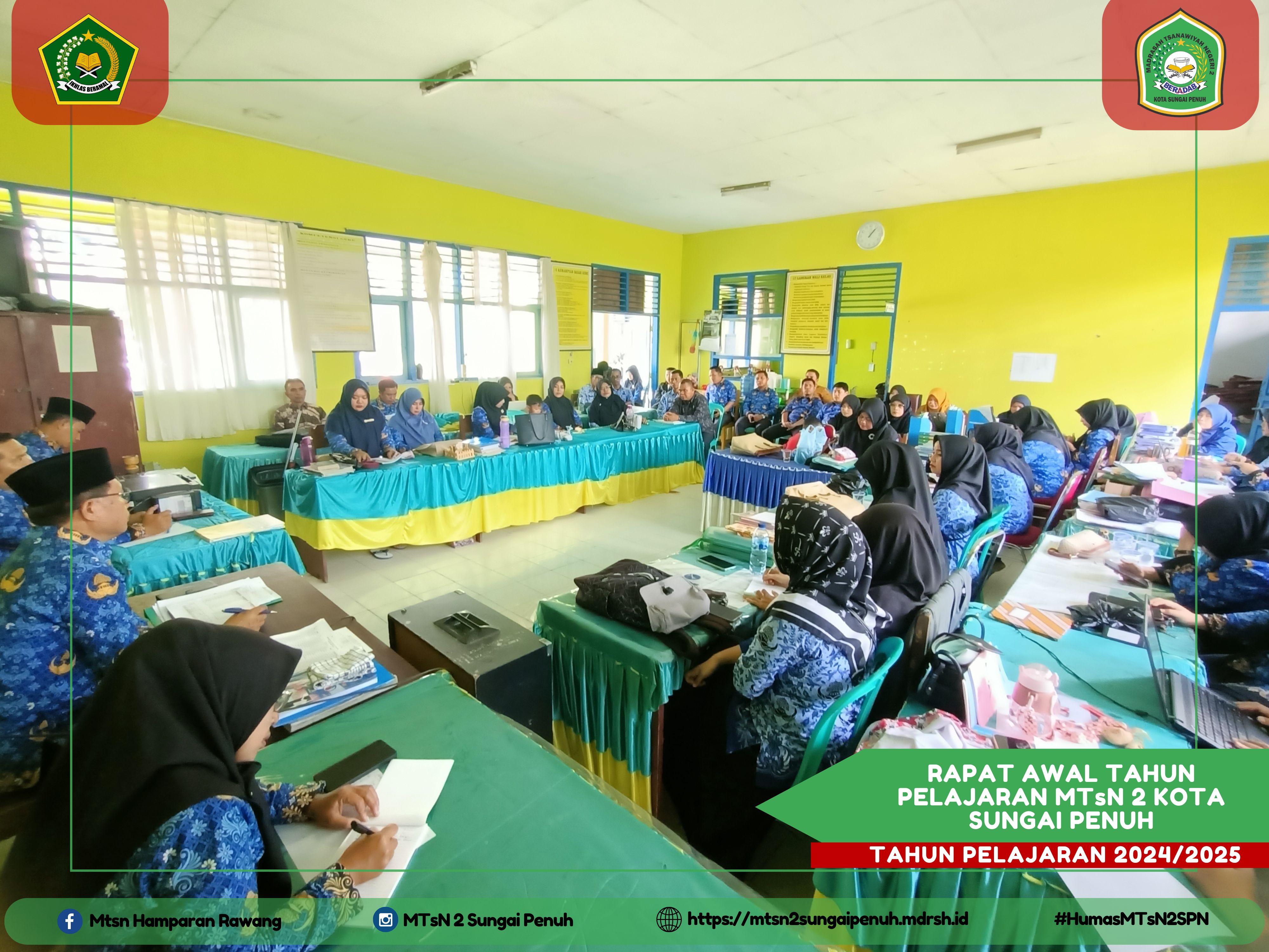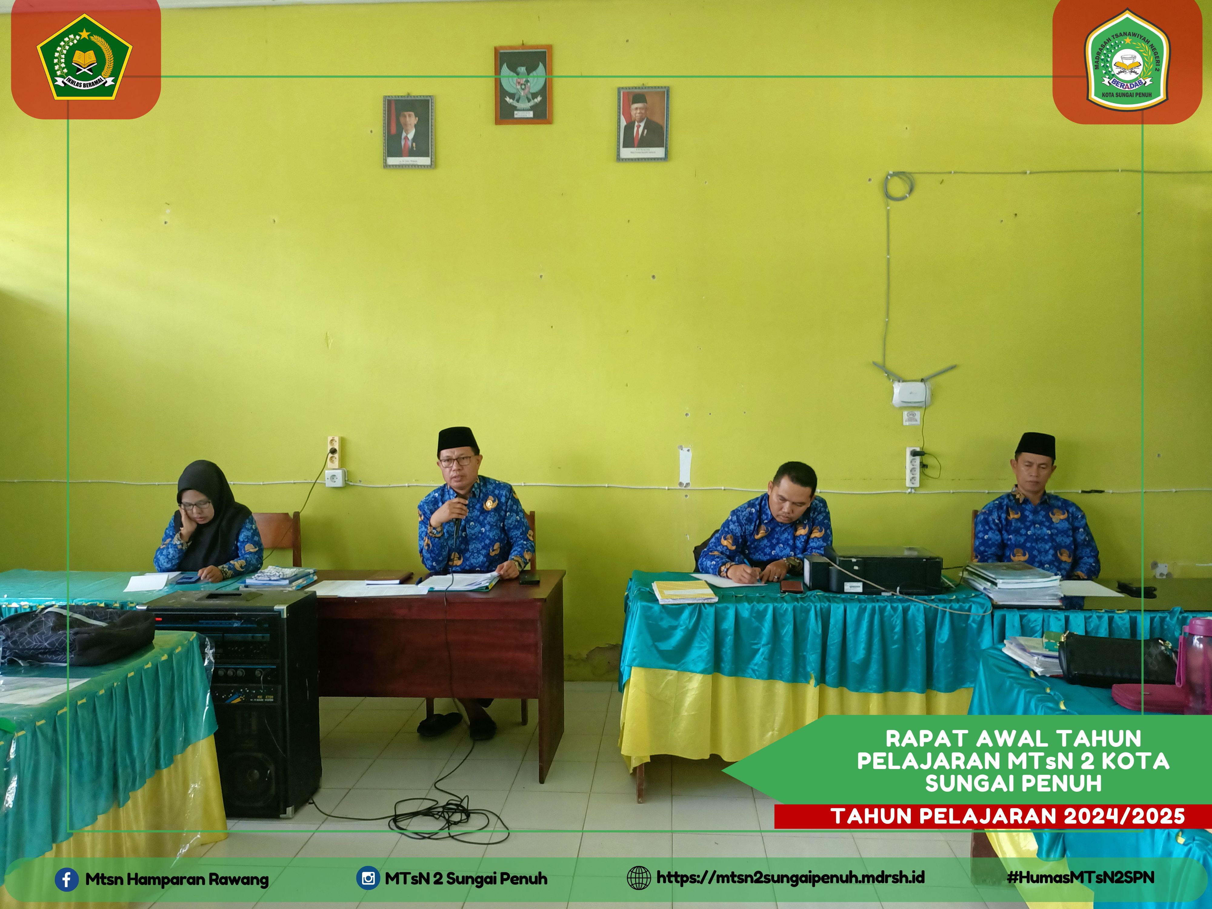 Sungai Penuh – Rabu (17/07/2024) Rapat awal Tahun Pelajaran untuk menyongsong Tahun Pelajaran 2024/2025 dilaksanakan hari ini. Rapat awal Tahun Pelajaran ini dipimpin langsung oleh Kepala Madrasah Syafri Juana, S. Pd, M. Pd di damping oleh Kaur Tata Usaha dan Para Wakil Kepala Madrasah dan juga yang dihadiri seluruh Pegawai dan Majelis Guru MTsN 2 Kota Sungai Penuh. "Terimakasih untuk dedikasi dan loyalitas Bapak, Ibu guru dan karyawan pada Tahun Pelajaran lalu, semoga apa yang telah kita lakukan kalau menjadi amal jariyah", ungkap kepala Madrasah dalam mengawali Rapat.