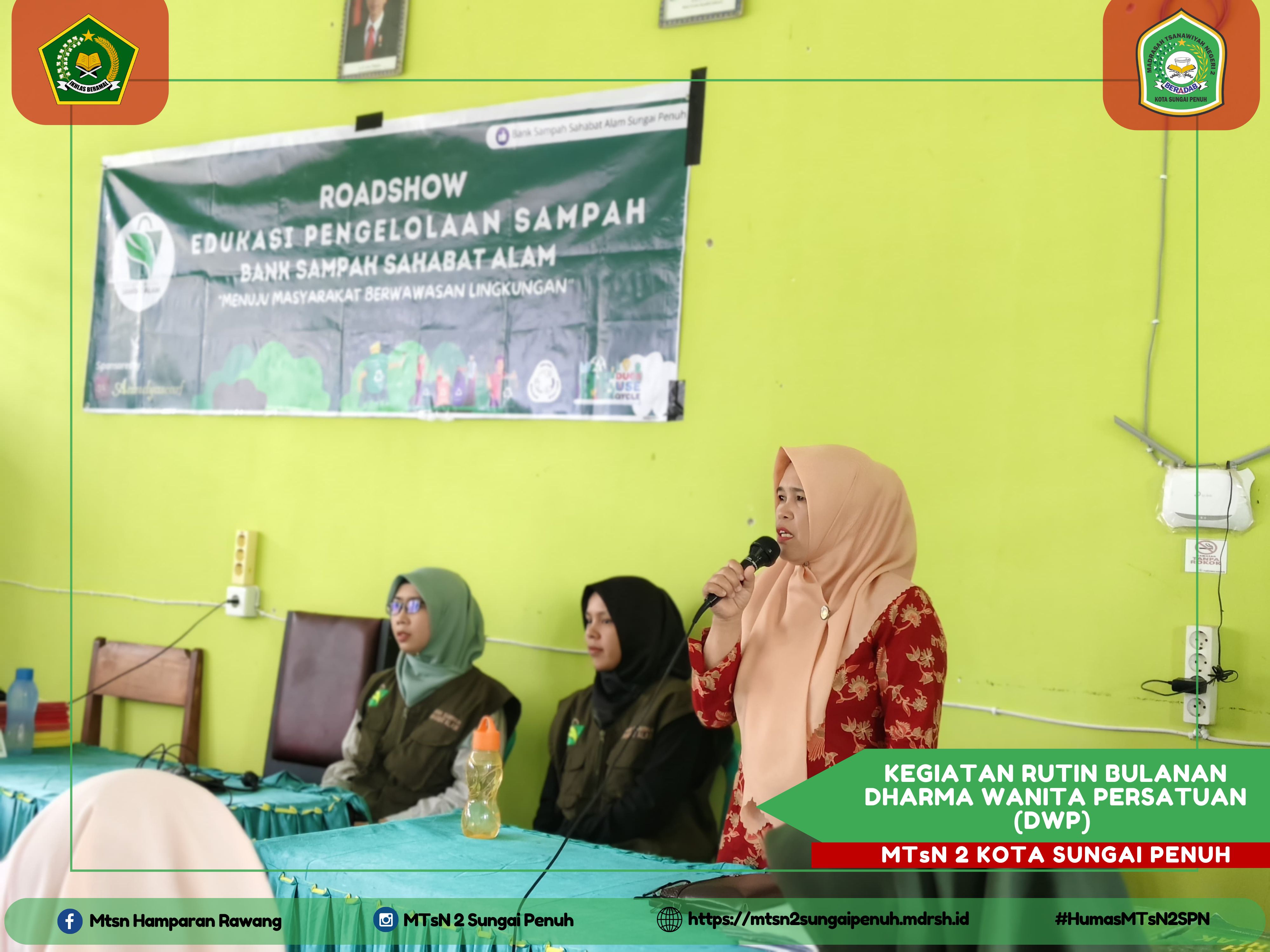 Dalam hal ini Nelvi Zusmira selaku ketua DWP MTs Negeri 2 Kota Sungai Penuh yang dalam sambutanya menyinggung program kerja ke depannya. “Saya harap ke depannya kita tetap kompak, Jikalau tidak ada halangan silahkan untuk menyempatkan hadir dalam agenda rutinan. Kemudian, untuk agenda hari ini kita kedatangan tamu dari Bank Sampah Sahabat Alam yang akan mensosialisasikan kepada kita semua tentang pengolahan dan pengelolaan sampah rumah tangga. Semoga apa yang disampaikan nanti dapat menambah wawasan atau pengetahuan kita semua.