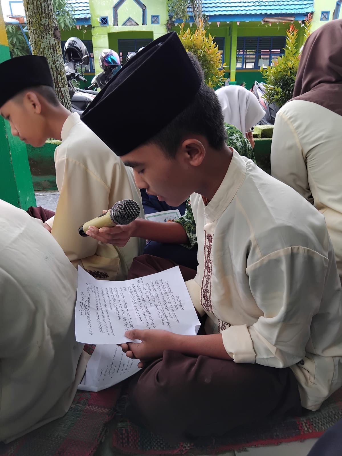 Di depan teras sekolah, siswa-siswi tersebut duduk dengan rapi dan memulai pembacaan yasin. Suara mereka yang seragam dan khidmat membuat suasana menjadi sangat tenang dan sakral.
