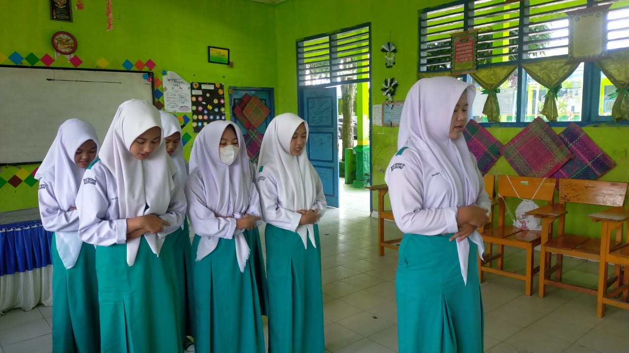 siswa melakukan praktik sholat jenazah di kelas masing-masing. Mereka berlatih melakukan takbir, membaca surat Al Fatihah, dan berdoa untuk jenazah.