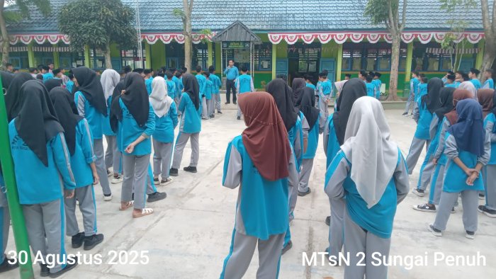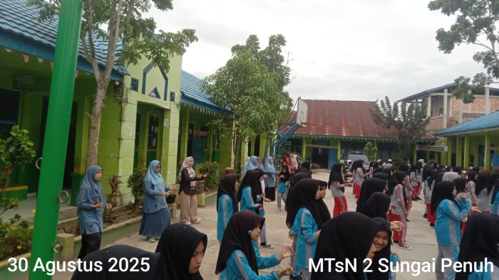 Sungai Penuh [30 Agustus 2025] - MTsN 2 Sungai hari ini mengadakan kegiatan senam pagi yang diikuti oleh seluruh warga madrasah. Kegiatan ini bertujuan untuk meningkatkan kesehatan dan kekompakan siswa/i, serta meningkatkan semangat belajar dan prestasi akademik. Senam pagi ini dilakukan di lapangan madrasah dan dipimpin oleh instruktur senam yang telah ditunjuk.
