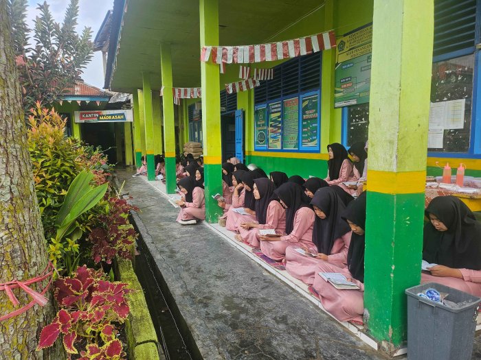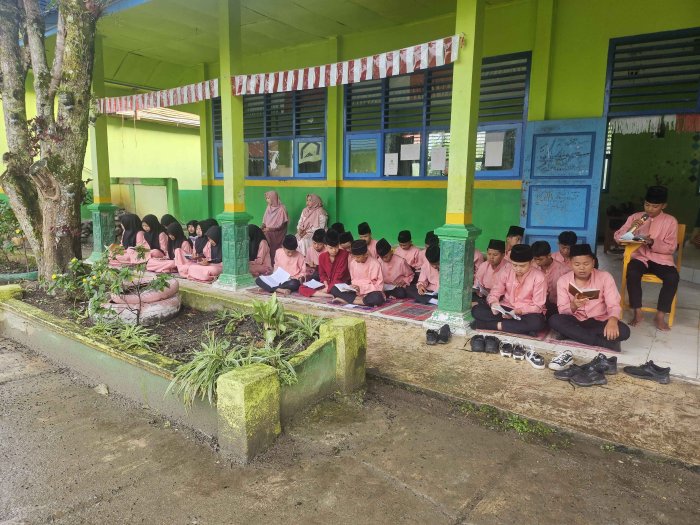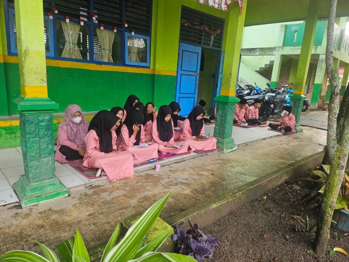 Siswa dan siswi MTsN 2 Sungai tetap melaksanakan kegiatan yasinan rutin meskipun lapangan madrasah tergenang air akibat hujan pada Jumat, 26 September 2025. Meskipun kondisi lingkungan kurang mendukung, kegiatan keagamaan ini tetap berlangsung dengan penuh semangat dan antusiasme dari para siswa.