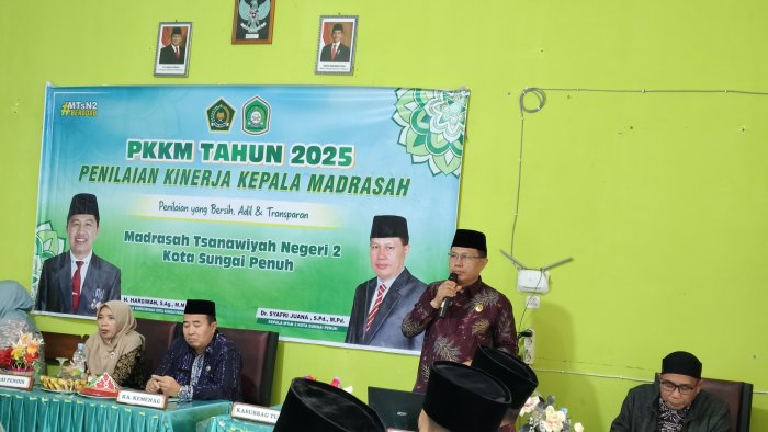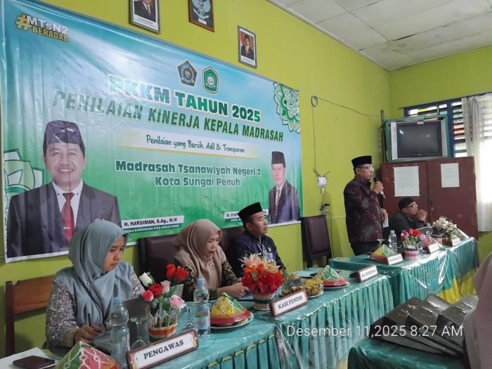 Penilaian Kinerja Kepala Madrasah (PKKM) di MTsN 2 Sungai Penuh dilaksanakan pada Kamis, 11 Desember 2025. Kegiatan ini merupakan agenda rutin yang bertujuan mengevaluasi kinerja kepala madrasah dalam menjalankan tugas serta tanggung jawabnya sebagai pemimpin di lingkungan pendidikan madrasah. Evaluasi ini penting untuk memastikan kualitas manajemen dan pelayanan pendidikan di madrasah tetap terjaga dan terus meningkat.