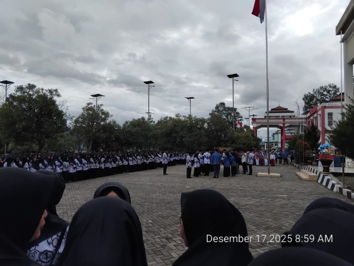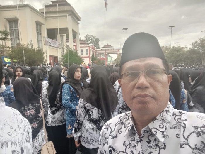 Kepala Madrasah Tsanawiyah Negeri (MTsN) 2 Sungai Penuh Dr. Syafri Juana S.Pd, M.Pd dan para guru menghadiri upacara peringatan Hari Guru Nasional tahun 2025. Kegiatan ini berlangsung di aula Walikota Sungai Penuh pada Rabu, 17 Desember 2025.