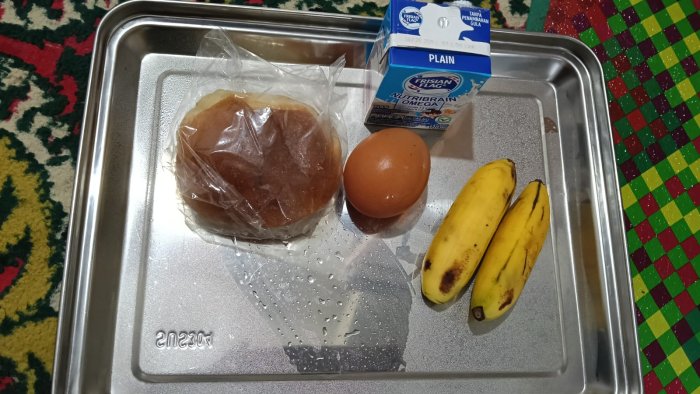 Selain itu, menu untuk hari Sabtu juga telah disiapkan dan dibagikan bersamaan pada hari Jumat. Menu Sabtu terdiri dari roti, telur rebus, susu, dan buah pisang. Kombinasi makanan ini bertujuan memberikan asupan energi, protein, serta kalsium yang baik untuk pertumbuhan dan kesehatan siswa.